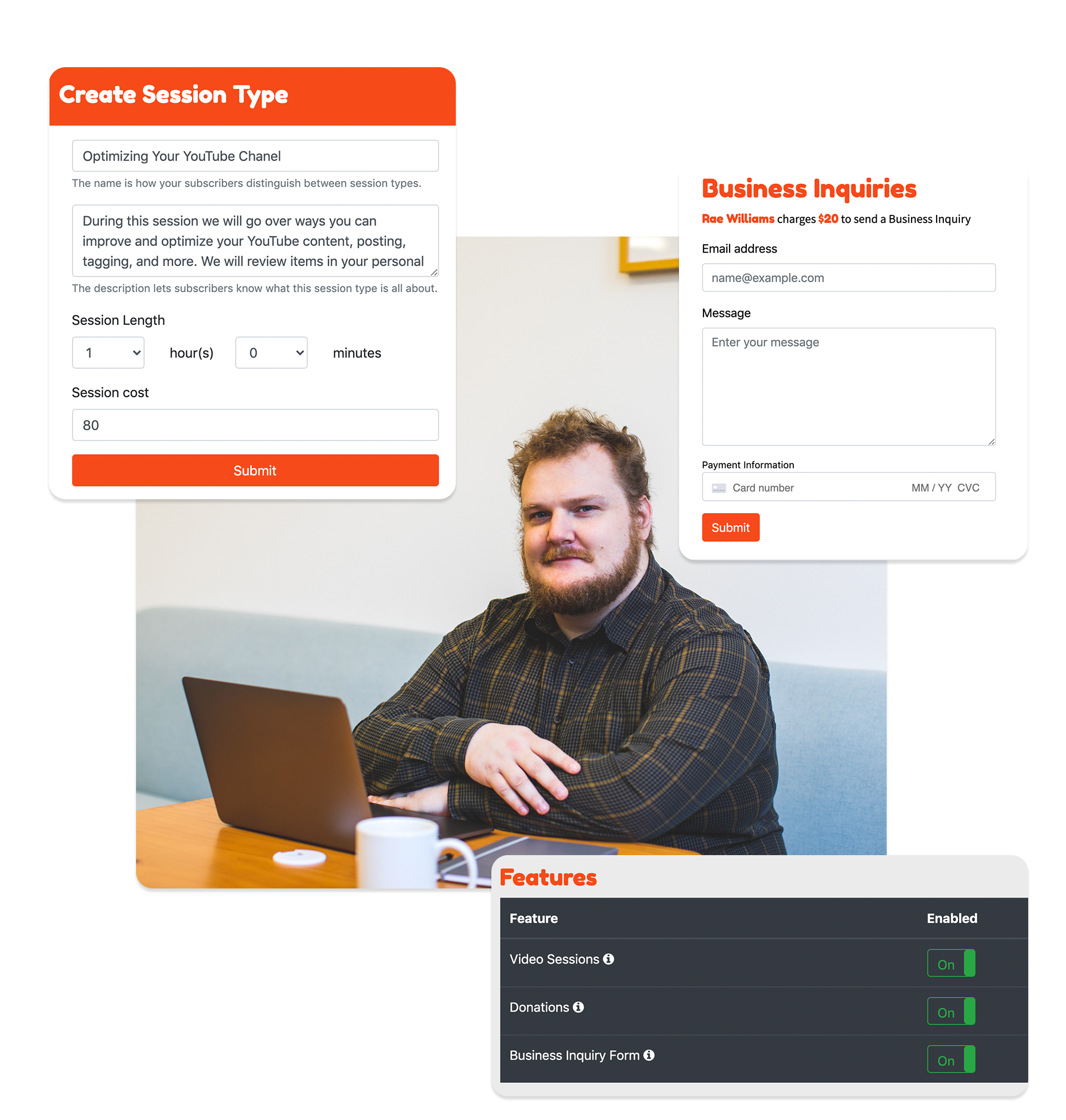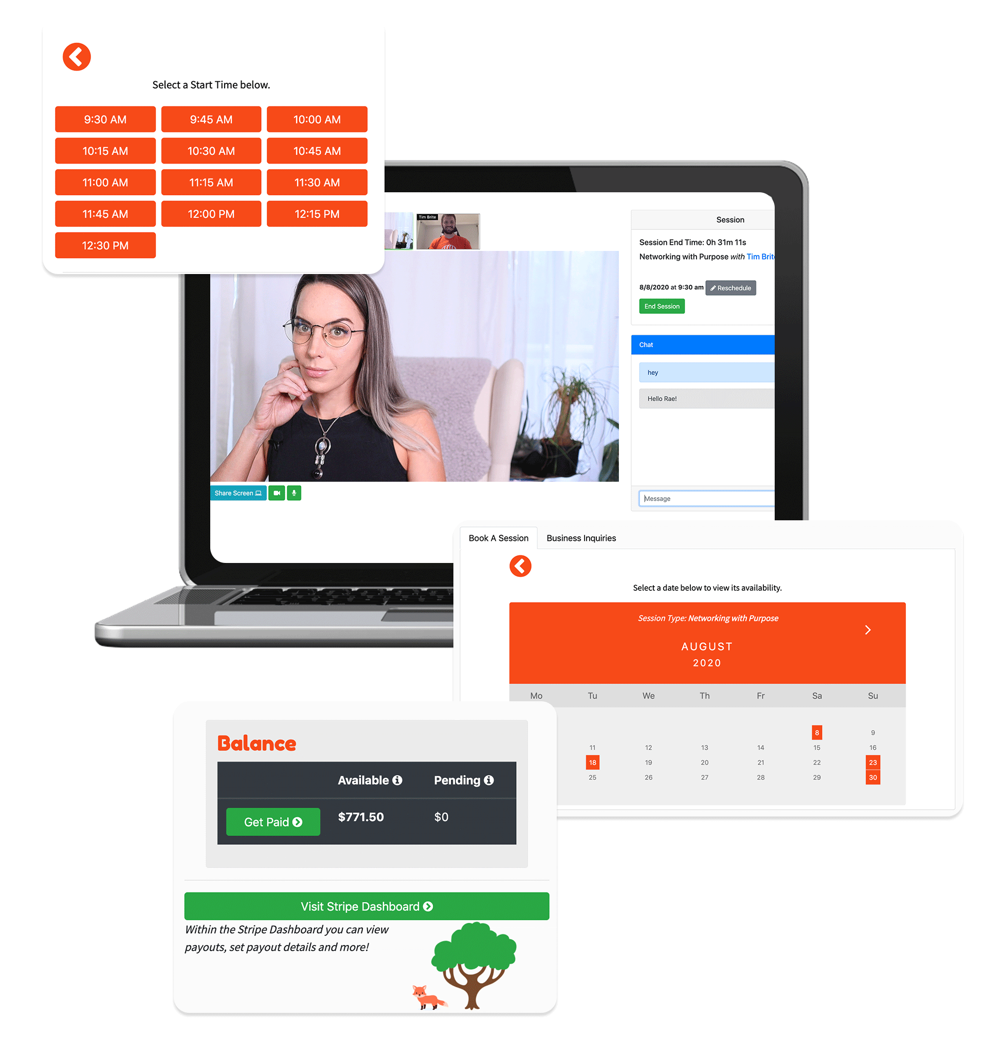Stay true to your brand by specifying fonts, colors, and img. Define the sessions and services you choose to offer. Share your link with the world.